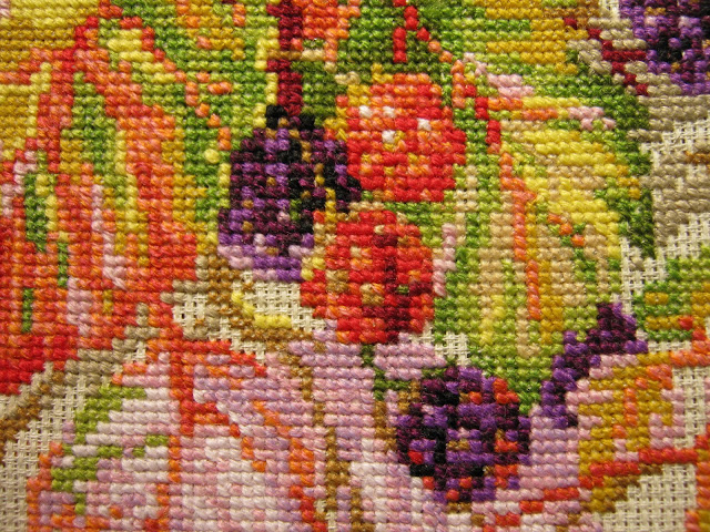 Канву (в наборе была Аида) я заменила на белую Муранку, не решилась экспериментировать с цветом, уж очень там сложное многоцветье для меня. Идет, как уже говорила, тяжело, но каждый появляющийся крестик люблю со страшной силой: